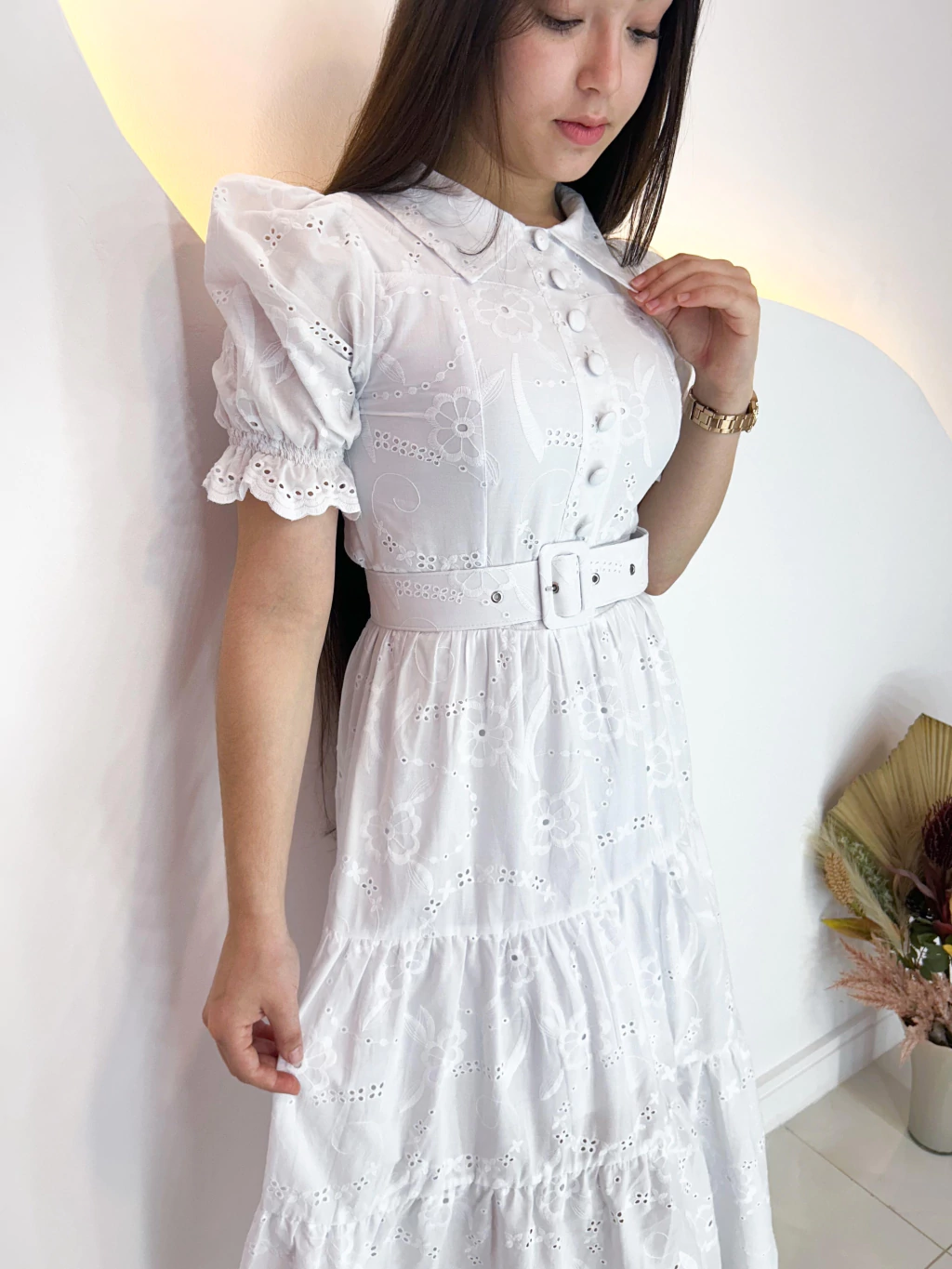 Descubra o Vestido Laise Amélie, uma peça midi que une delicadeza e sofisticação. Com botões funcionais e bordados em relevo, suas mangas curtas princesinhas bufantes, com lastex nos punhos, realçam a feminilidade. Acompanha cinto que acintura, valorizando sua silhueta com elegância.