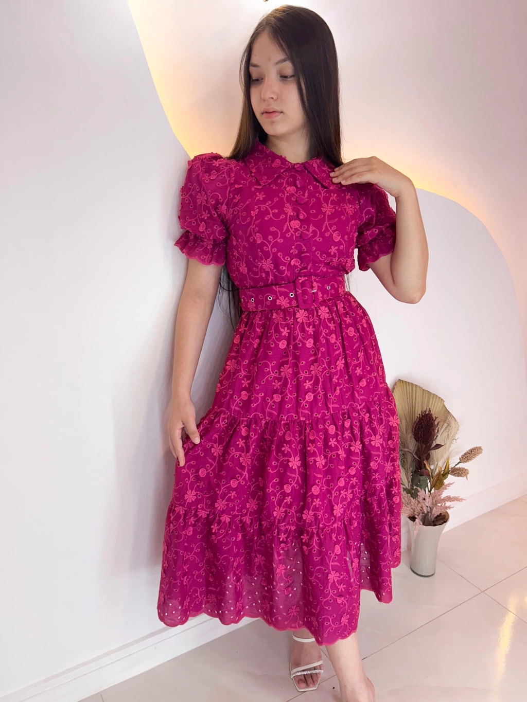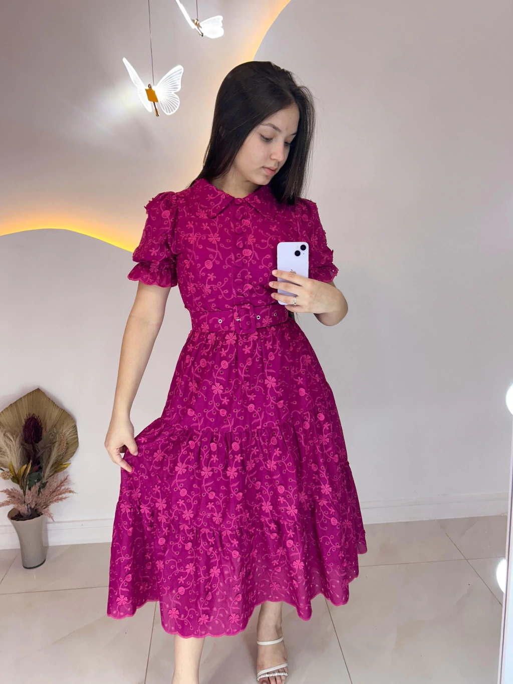 Descubra o Vestido Laise Amélie, uma peça midi que une delicadeza e sofisticação. Com botões funcionais e bordados em relevo, suas mangas curtas princesinhas bufantes, com lastex nos punhos, realçam a feminilidade. Acompanha cinto que acintura, valorizando sua silhueta com elegância.