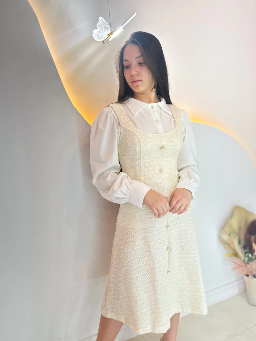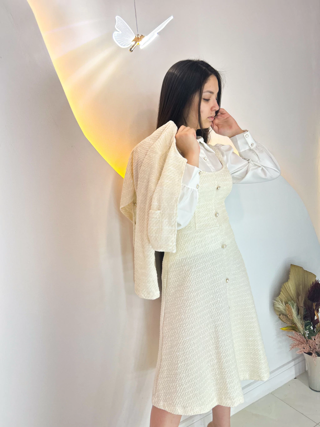 Apresentamos o Vestido Cerejeira, uma obra-prima confeccionada em tweed de altíssima qualidade. Este modelo MIDI é realçado por fios de lurex, proporcionando um brilho sutil e sofisticado. As mangas curtas e os botões fake em formato de coração trazem um toque lúdico e elegante. Com bolsos fakes adornados com detalhes brilhantes, este vestido é perfeito para quem busca charme e estilo em cada ocasião.
